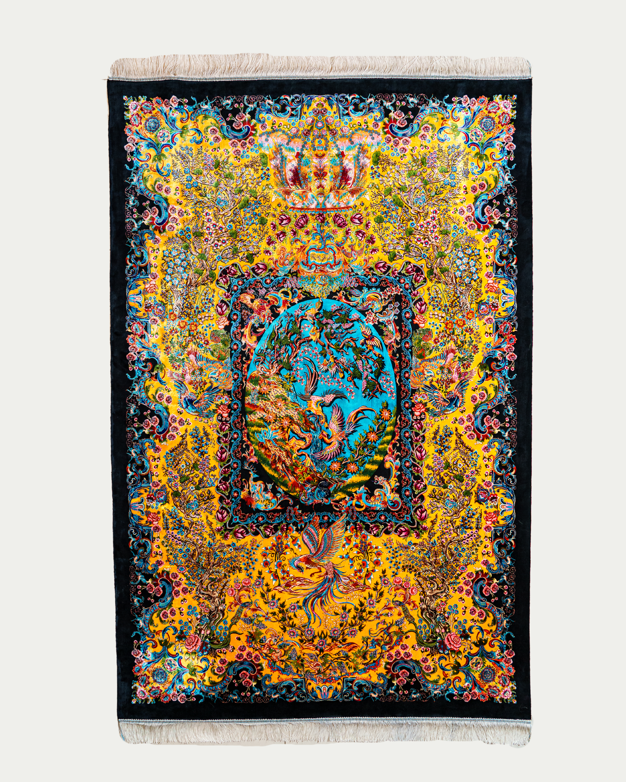 The Ghoghnoos rug captivates with its vibrant turquoise backdrop and central medallion featuring birds in flight, symbolizing movement and nature. Surrounded by intricate floral patterns on a bold yellow base, this luxurious piece brightens any space with its radiant, nature-inspired design.