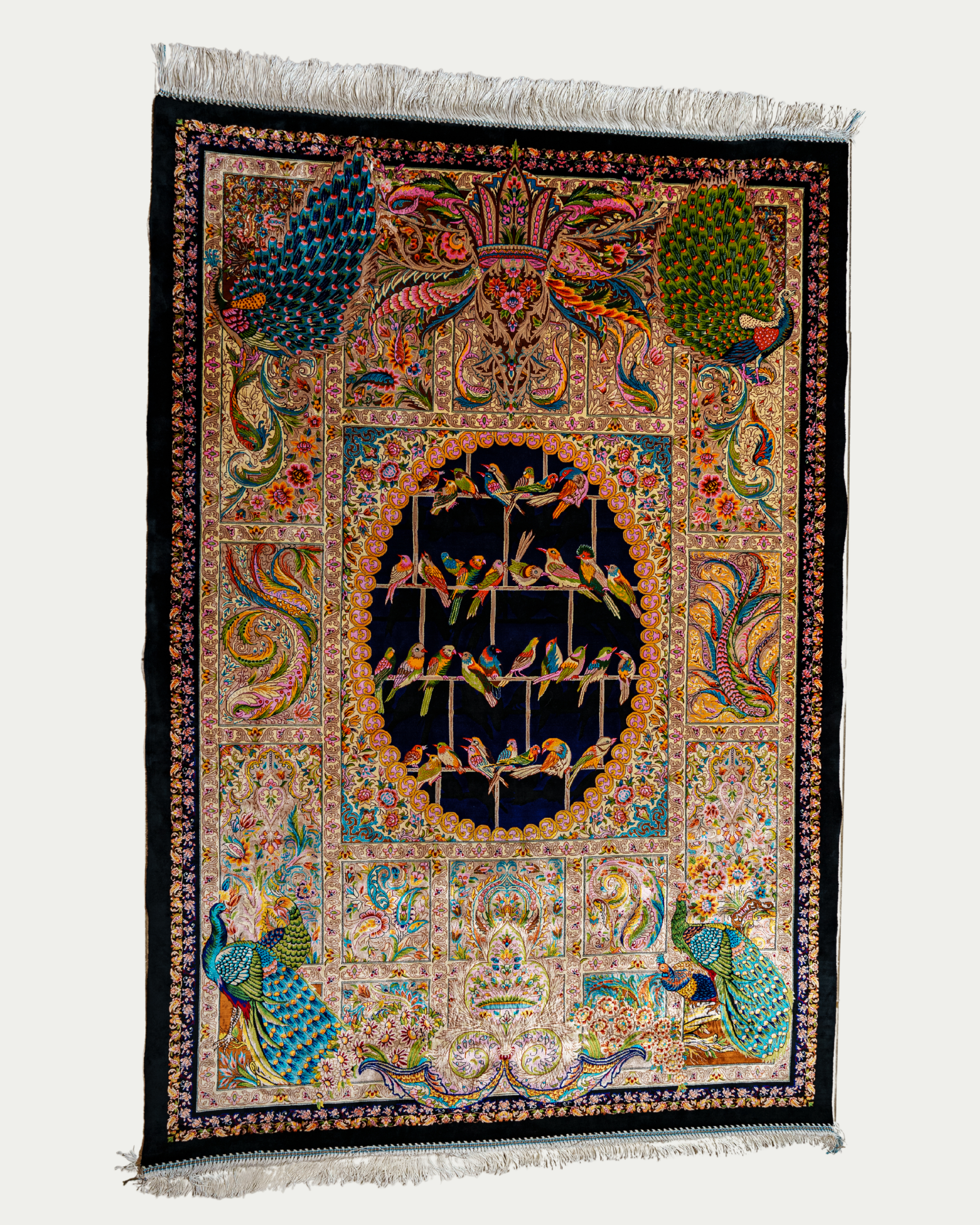 The Homa rug beautifully captures the elegance of nature, featuring majestic peacocks and birds of paradise in a richly detailed design. A striking black oval medallion serves as the backdrop for vibrantly colored birds perched on delicate branches, surrounded by lush floral and paisley patterns that highlight the grandeur of Persian artistry.
