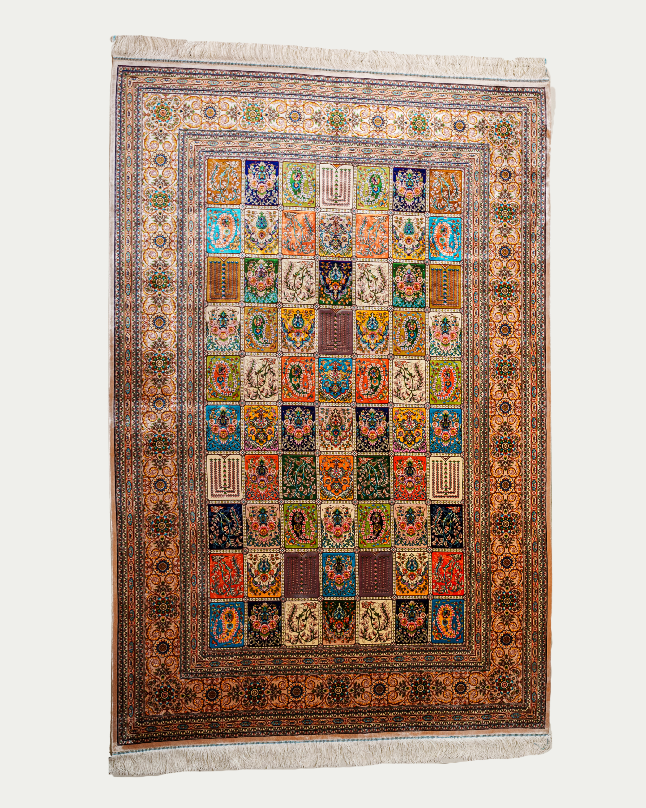 Elevate your home with the Kasraz Handwoven Persian Silk Rug, featuring a stunning multi-panel design that tells stories from Persian culture through intricate animals, mythological figures, and floral motifs. Each richly detailed panel captivates the eye, set against a luxurious backdrop of deep gold, burgundy, emerald, and sapphire, with delicate accents of pink, ivory, and blue adding depth and vibrancy.
